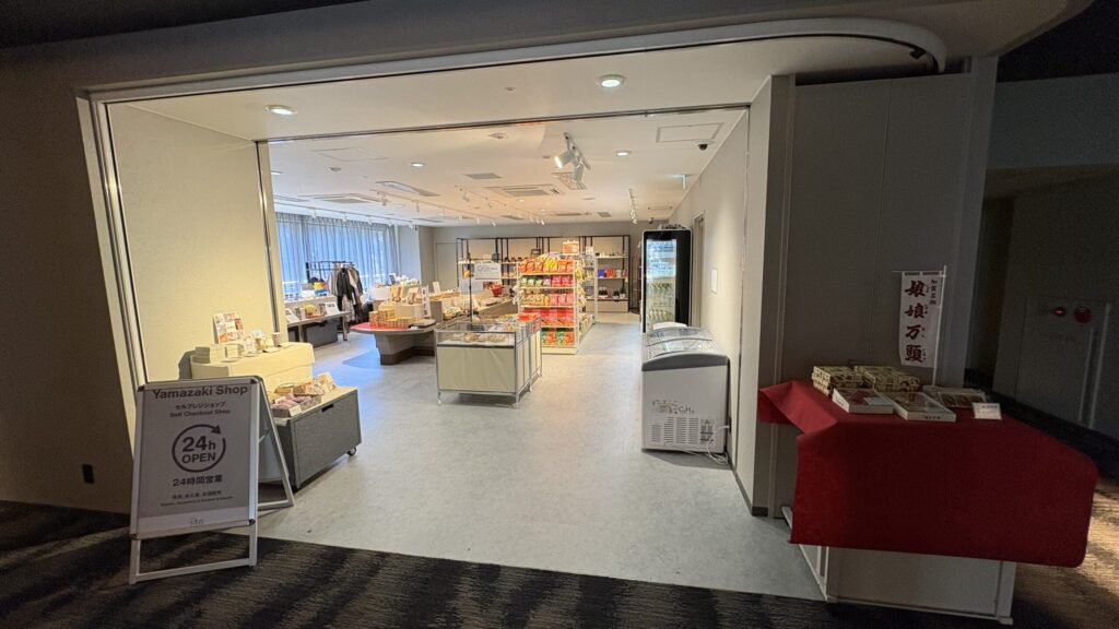 おつまみや飲み物のほか、お土産も揃っています。今回は購入には至りませんでしたが、軽く立ち寄るだけでも旅の気分が上がるラインナップでした。深夜でも利用できるのは嬉しいポイントです。なお、セルフレジのみで現金払い不可なので、カードや電子マネーの準備をお忘れなく。