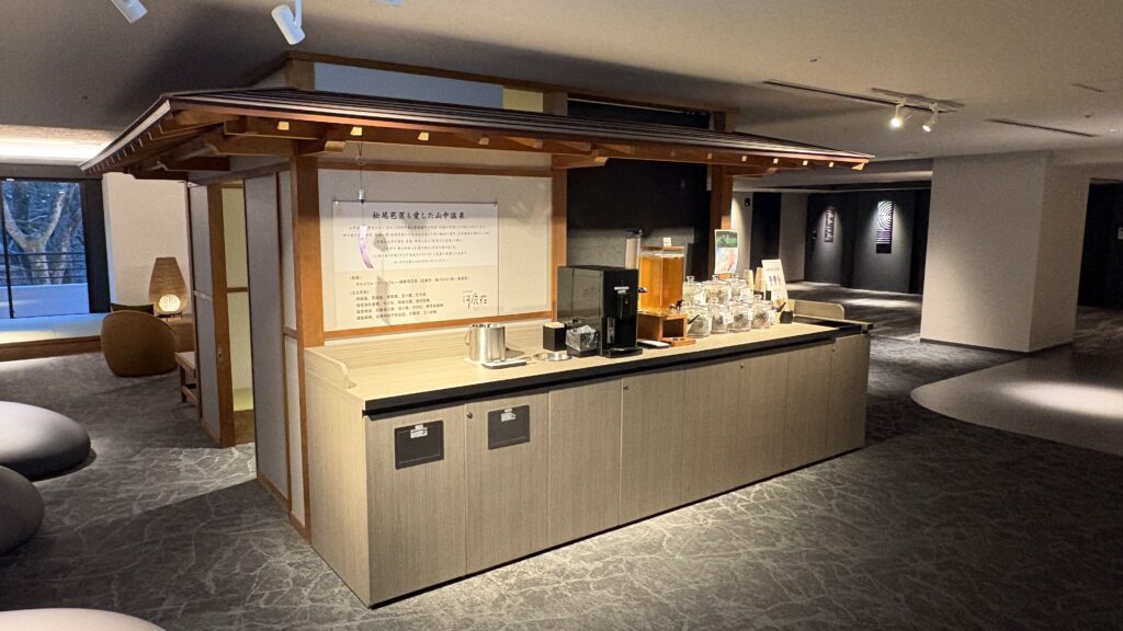 温泉の後は、大聖寺川を望む湯上りラウンジ(2F)でひと休みできます。加賀棒茶や湯上がりアイスが用意されており、川のせせらぎを聞きながらゆっくり過ごせます。