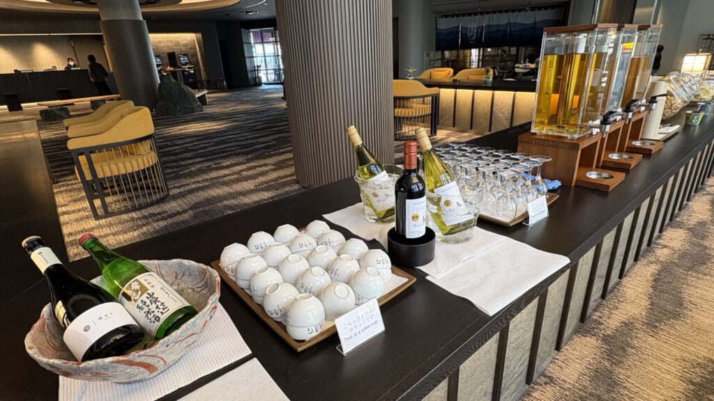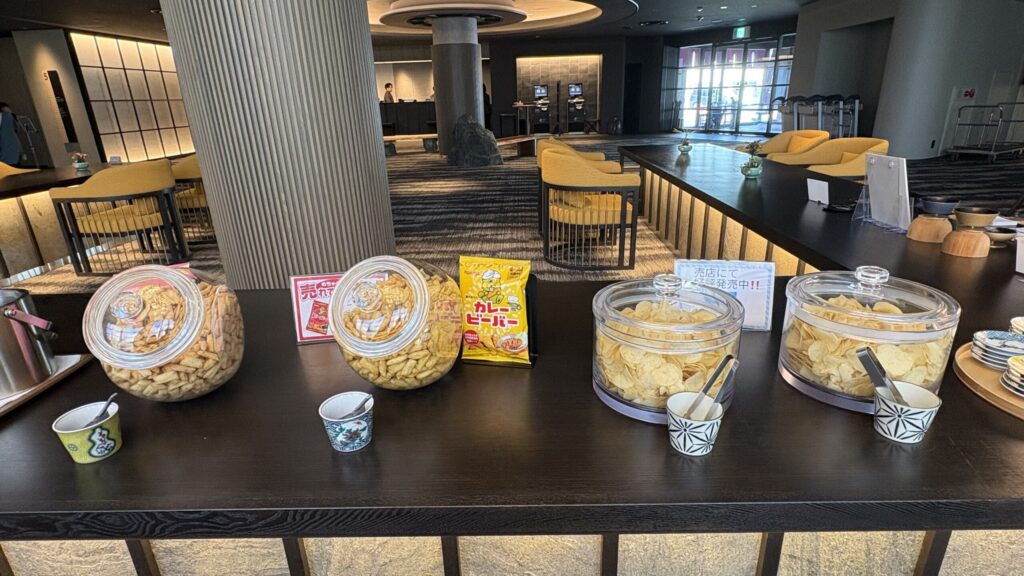 チェックインを終えたら5Fラウンジでウェルカムドリンクをどうぞ。セルフ形式で、ドリンクとスナックが自由に取れるようになっていました。