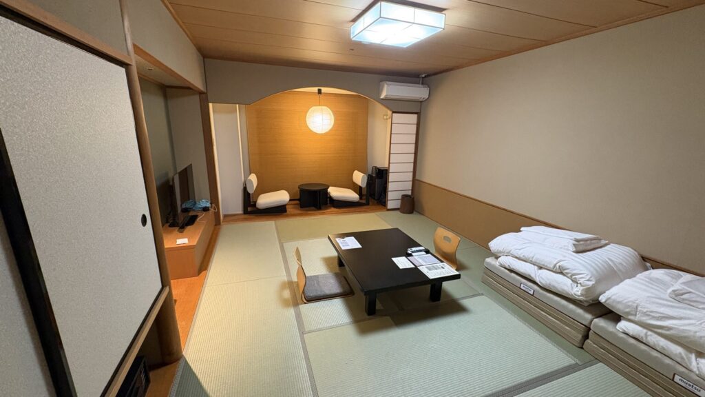 案内されたのはスーペリア(和室)。広さと清潔感は十分で、ゆったりくつろげる空間でした。山側の部屋でしたが、特別な眺望というわけではなく、あくまで「落ち着いて過ごせる和室」という印象です。